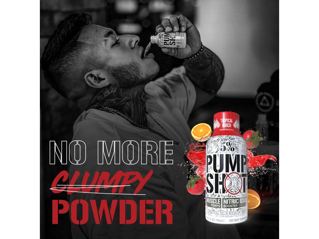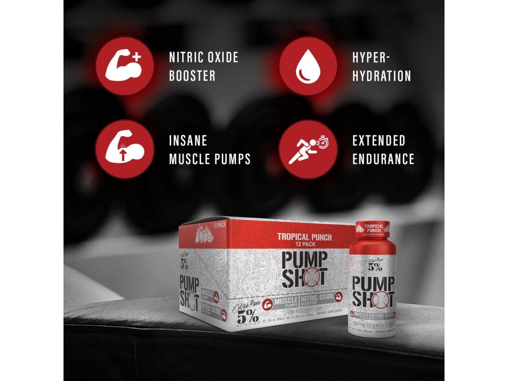 Pump Shot je předtréninkový 2 oz (≈59 ml) nápoj s obsahem 20 g glycerolu a patentovaným komplexem S7® (50 mg). Za pouhých 30 minut před tréninkem vám zajistí extrémní svalový pump, hyperhydrataci, zlepšenou výdrž a výkon. (Prodávají se jednotlivě)