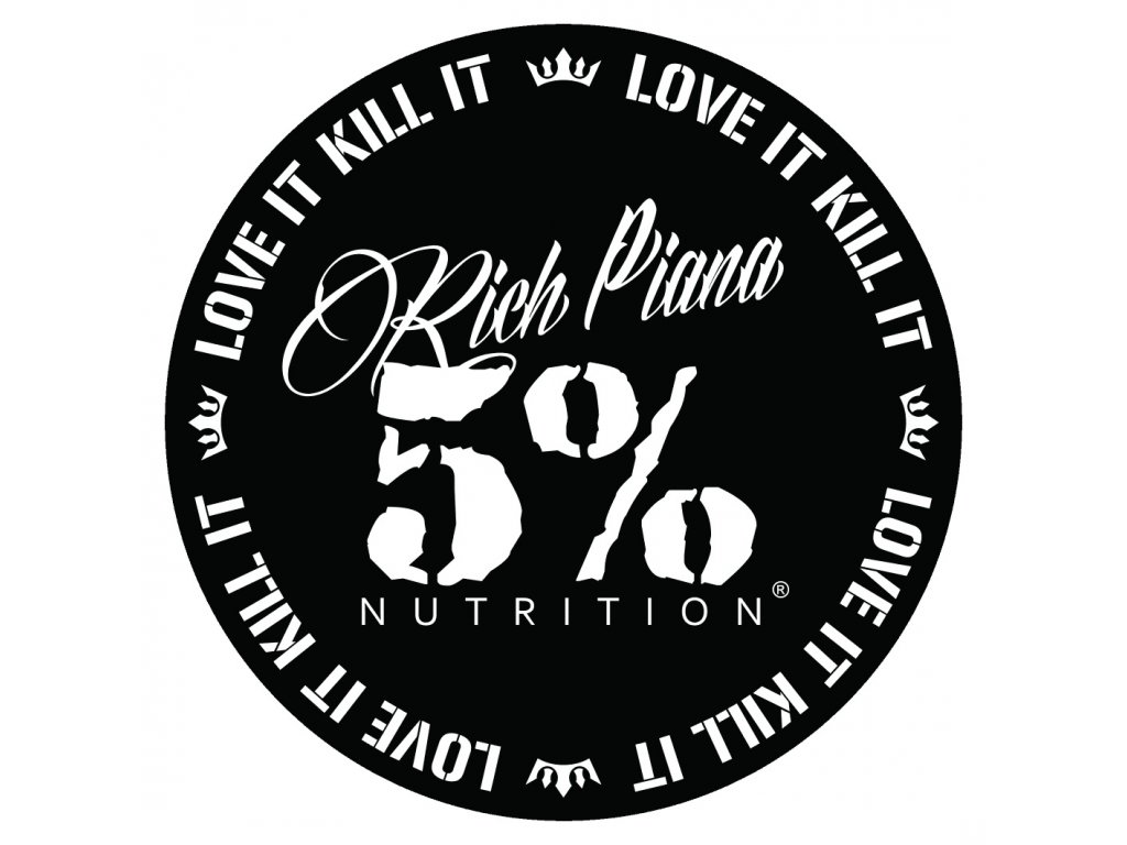 - Černý kruhový obtisk s plným podpisem Rich Piana 5% Nutrition s bílým logem uprostřed; obklopený nápisem "Love It Kill It" a korunkami RP na vnější straně, rovněž v bílé barvě.